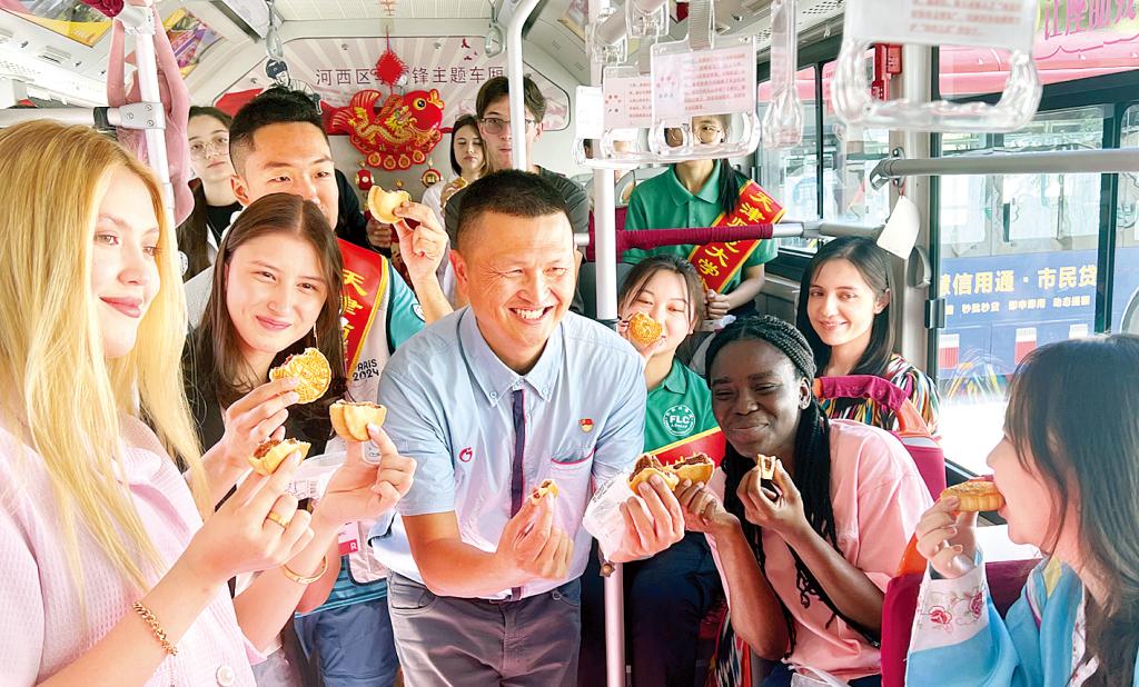 昨天上午,來自天津師范大學(xué)國際教育交流學(xué)院和外國語學(xué)院的10名外籍大學(xué)生、2名少數(shù)民族大學(xué)生、6名雙語翻譯志愿者及4名帶隊老師,走進市公交集團第二客運有限公司體北中心車隊,乘公交、聽故事、賞古曲、吃月餅,與公交職工共度中秋團圓節(jié)。