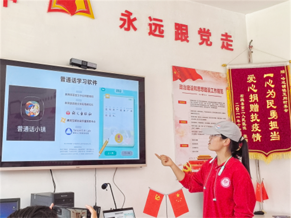 (圖為實踐團成員為當地村干部和群眾講解普通話學習應用軟件)