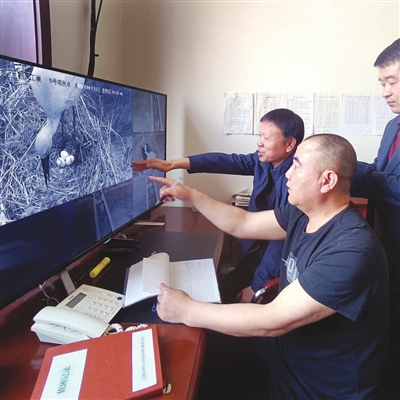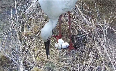 目前,5個巢穴都發現了東方白鸛的身影,其中,第5號巢穴已發現了3枚鸛卵。