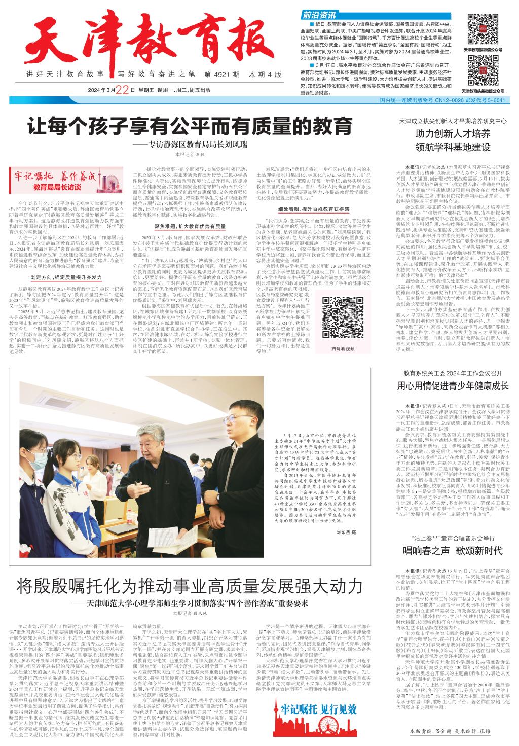 天津師范大學黨委常委、副校長白學軍在心理學部學習貫徹落實習近平總書記視察天津重要講話精神暨2024 年重點工作研討會上提到,習近平總書記親臨天津視察調研并發表重要講話,在天津社會主義現代化建設進程中具有里程碑意義,為天津之為指出了實踐路徑,也為學校事業發展指明了前進方向、提供了科學指引,具有重要指南針意義。心理學部要圍繞“四個善作善成”,不斷提振干事創業的精氣神,繼續發揚沈德立先生等老一輩師大人的優良傳統,努力奮斗,把不可能的、不具備條件的事情變成可能,把平凡的工作干成不平凡,為全面建設社會主義現代化大都市、奮力譜寫中國式現代化天津篇章貢獻力量。