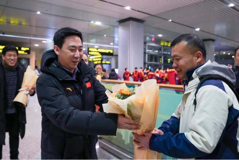 “祝賀大家圓滿完成實習支教任務,我們代表全校師生接你們回家啦!”在機場出站口,副校長陳玳瑋與隨行人員一起向支教團帶隊教師送上鮮花、為同學們送上龍年紀念玩偶和慰問包,并與大家親切交流。他代表學校對援疆支教師生的辛勤付出表示感謝和敬意,對師生圓滿完成本次支教任務順利返校表示祝賀和歡迎。他說,支教團的行動牽動著全校師生的心,我們無時無刻不在惦念和關心著支教師生,同學們是新時代好青年,是師大的驕傲,希望同學們將此次難忘的青春歷練和寶貴的精神財富傳承下去,賡續奮斗、勇毅前行,為黨和國家的教育事業貢獻青春力量。