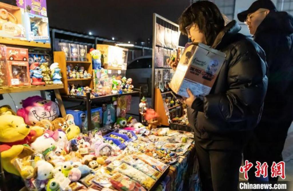 11月28日晚,在天津市北辰區的“中古玩具鬼市”,游客正在玩具攤位前“淘寶”,尋找童年的回憶。 王在御 攝