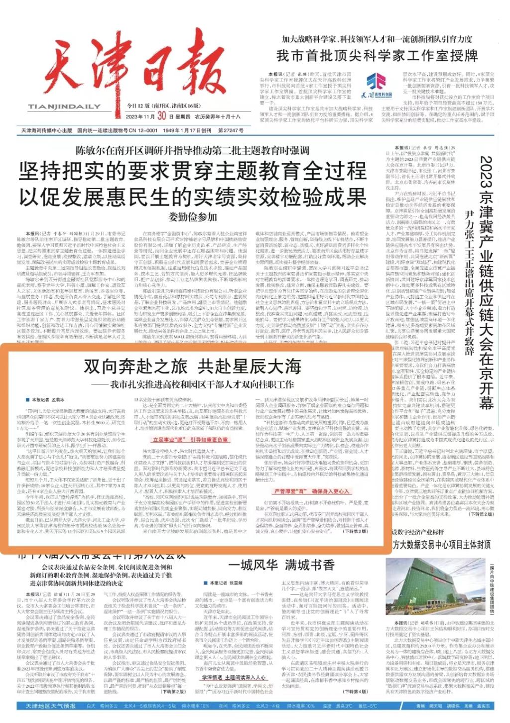 “重點讓掛職干部在招商引資、人才引進、科技成果轉化方面牽線搭橋,助力區域高質量發展。目前,在掛職干部的撮合下,濱海—中關村科技園深入對接天開園開展合作洽談,自貿局、科技局領導班子到天津大學進行調研座談,在推動校地共建、深化產學研合作、共享應用場景資源等方面達成了多項合作共識。”張青說。