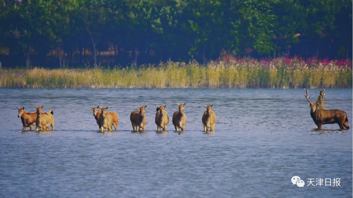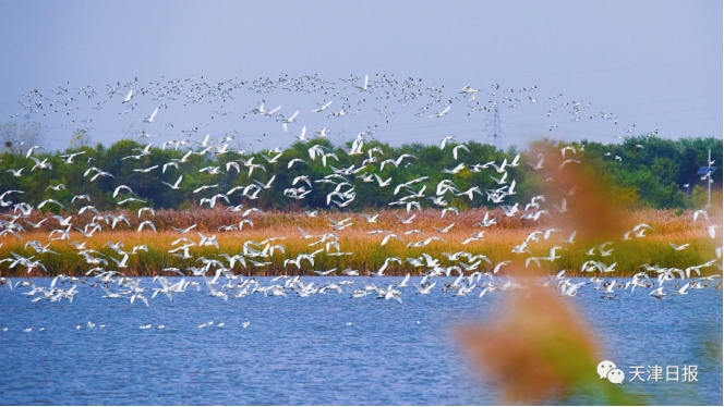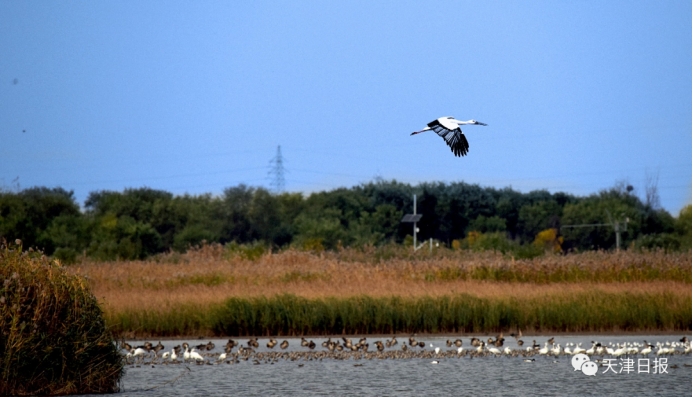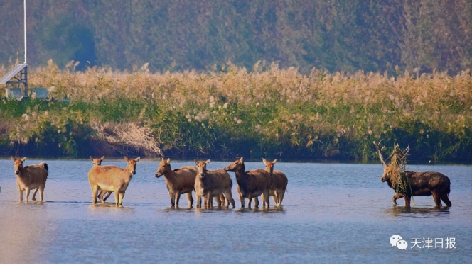 “看,麋鹿來啦!”說話間,遠處蘆葦蕩出現了一群膘肥體壯的“四不像”。“一共有9頭麋鹿,這是一個小群落。長著鹿角的是成年雄鹿。”站在葦塘邊,趙大鵬介紹,“七里海濕地是麋鹿的天然食堂,良好的生態環境帶來豐富的食材。研究麋鹿的食性和食譜對于保護這個物種至關重要。據七里海濕地自然保護區工作人員觀測,目前的麋鹿種群已達到31頭?!?strong>七里海濕地是“東亞—澳大利西亞遷飛區”候鳥遷徙路線的重要停歇地。生態環境好不好,鳥兒會用翅膀來“投票”。據七里海濕地自然保護區工作人員觀測,當日已經有上萬只候鳥飛臨七里海濕地,其中,東方白鸛、天鵝、白琵鷺等珍稀鳥類超過2000只。
