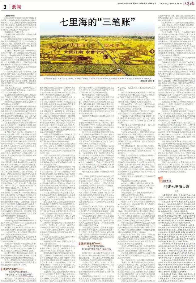 初冬時節,七里海濕地自然保護區內碧波粼粼、蘆花搖曳、鷗鳥翔集。東方白鸛、天鵝、白琵鷺、反嘴鷸等遷徙候鳥接踵而至,與葦海中時隱時現的麋鹿群落,勾勒出一幅美妙的生態畫卷。人與自然和諧共生,生態與產業“雙向奔赴”。如今,沿著七里海濕地自然保護區生態廊道,建成了生態文旅觀光帶、生態農業種植區、生態產業聚集地、生態宜居新市鎮,為生態優、環境美的七里?!拌偵稀碑a業綠、村民富的“金邊兒”。10月28日,生態環境部命名第七批生態文明建設示范區,寧河區榮膺“國家生態文明建設示范區”稱號。然而,十幾年前的七里海卻是另一番模樣。七里海濕地1992年就被列入國家級古海岸與濕地自然保護區,但不合理的開發,使得七里海的“生態存折”一度入不敷出。七里海濕地公園開張納客,鳥類的天堂變成游客的樂園。同時,濕地保護區內水產養殖造成的環境問題也時有發生。一時間,七里海濕地生態承載力亮起了紅燈。國家級自然保護區變身濕地公園,顯然是觸碰了生態保護紅線。2015年,已經成為4A級景區的七里海濕地公園,被生態環保部門責令關停。七里海出現的“生態病”愈發嚴重,2017年7月,被中央第一環境保護督察組“點名”問責。河海之變,源于思想引領。寧河區躬身踐行習近平新時代中國特色社會主義思想,以習近平總書記對七里海濕地的重要批示精神為強大政治動力,堅決貫徹落實市委、市政府的部署要求。立下軍令狀、鋪開施工圖,一場雷厲風行、聲勢浩大的生態環保攻堅戰全面打響,七里海濕地生態保護修復“十大工程”全面開工。在習近平生態文明思想引領下,七里海生態保護駛入美麗中國建設的快車道。學好用好“兩山論”、走深走實“兩化路”,寧河區精算生態保護、綠色發展、民生改善“三筆賬”,綠水青山的“生態指數”、產業發展的“綠色指數”、人民生活的“幸福指數”同步提升。從曾經的生態環?!昂筮M生”到如今的生態文明“尖子生”,七里海蛻變重生。七里海濕地自然保護區生態保護修復的“寧河樣本”,從一域走向全國。連日來,記者走進寧河區,環七里海濕地自然保護區進行調研采訪,體察創建國家生態文明建設示范區的“寧河方案”,破解統籌高質量發展和高水平保護的“生態密碼”,展現美麗中國建設的新范式。