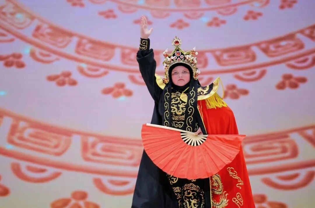 A contestant from Iceland performs Sichuan face-changing opera in costume.