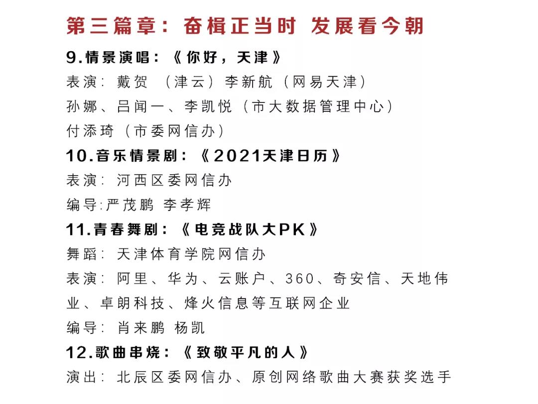 天津市網絡春晚自2018年開始已連續舉辦五年,是網信戰線的一場文化盛會。今年的晚會由《寅虎迎新春,網絡中國節》《同心戰疫情,攜手護津城》《奮楫正當時,發展看今朝》《冰雪冬奧會,一起向未來》《喜迎二十大,啟航新征程》五個篇章組成。除少數專業院團演員參演外,大部分節目由網信系統的機關干部、媒體編輯、高校師生、互聯網企業員工和好網民志愿者演出。