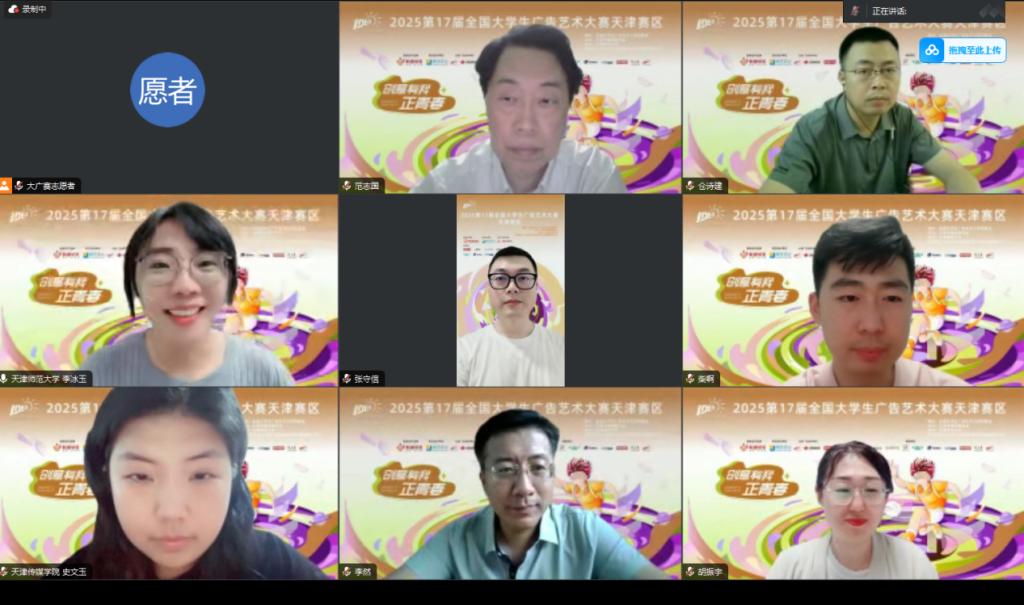 在各高校完成校賽推選工作的基礎上,天津賽區初審于6月27日至30日在線上開展,按類別分為平面設計、影視廣播廣告、互動微電影、短視頻動畫、科技策劃文案5組。來自天津各高校的專業教師與業界代表組成評審團隊,每組5位評委。經過嚴謹篩選與公正投票,最終評選出1389件優秀作品入圍市賽終審。
