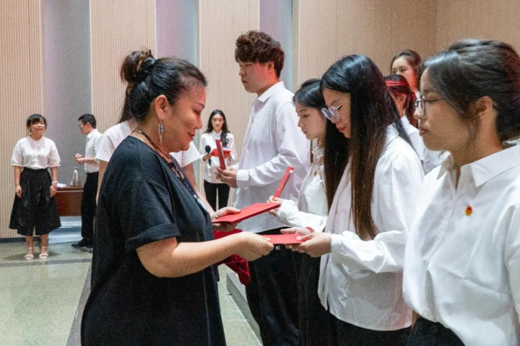 出席儀式的領(lǐng)導(dǎo)老師為新黨員佩戴黨員徽章,并發(fā)放政治生日卡、黨章;為新團(tuán)員佩戴團(tuán)徽,并發(fā)放團(tuán)員證和團(tuán)員生日卡。