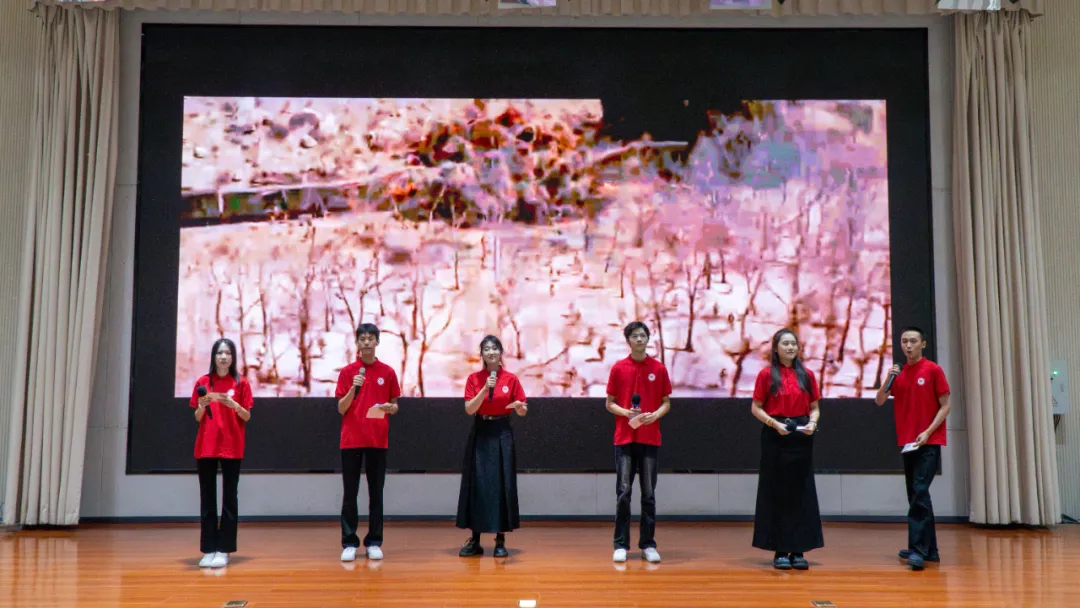 2418班王韻然、王楚涵、張藝楊、陳棕熠、劉俊言、孫圣羿同學(xué)帶來詩朗誦《百年風(fēng)華正青春》。他們用鏗鏘有力又飽含深情的嗓音,謳歌革命先輩的堅定信仰與不朽功勛,展望新時代青年接力奮斗、開創(chuàng)未來的壯志豪情。