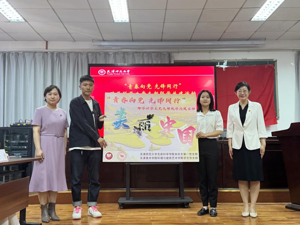 雙方黨支部代表共同完成了跨學科學生黨支部共建儀式,由天津美術學院環境與建筑藝術學院設計、制作并蘊含著學科特色的“美”字,和天津師范大學生命科學學院以蝴蝶、鳥類翅膀為素材拼制成的“麗”字,共同組成了“美麗中國”四字畫卷,標志著兩院學生黨支部在跨學科合作方面邁出了堅實的一步。
