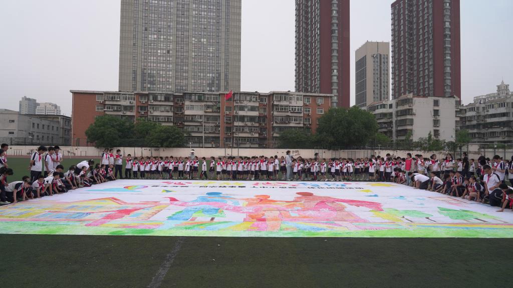 實踐活動以“心律動·心飛揚”為主題。其中“春生萬物·同心繪未來”藝術創作特色環節,來自美術與設計學院、天津市第四十二中學和湘江道小學的400余名學生被分為8組,在綠茵場上共同完成了一幅長12米、寬15米的納斯卡巨畫。這幅匯集三校學子智慧的藝術作品,生動地展現了美育傳承與創新在當代的內涵。