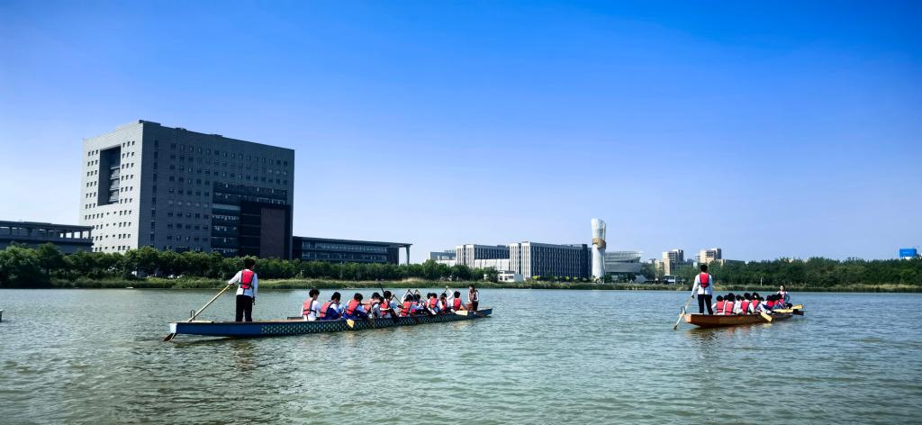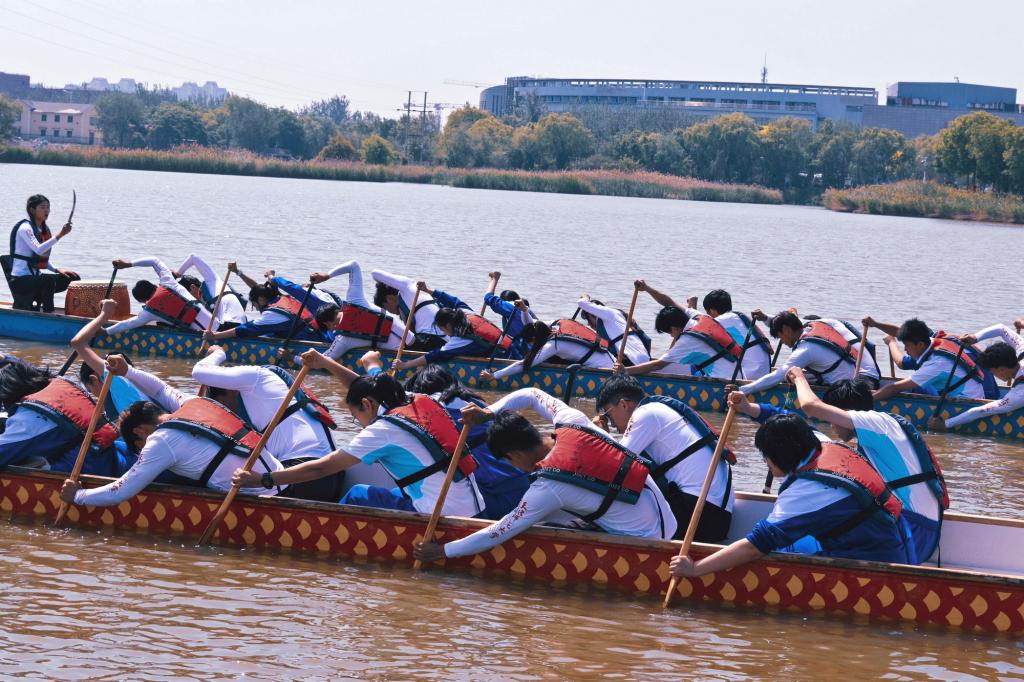 海河中學學生現場觀摩了正在備戰澳門國際龍舟賽的天津師范大學龍舟隊集訓的場景。飛濺的浪花、整齊的號子、矯健的身姿,展現出體育競技的精彩與團隊協作的精神。在大學生的幫助下,十余名海河中學學生首次登上龍舟,與大學生一起親身體驗傳統文化的魅力和水上運動的樂趣。從握槳姿勢到劃水節奏,從平衡控制到團隊配合,大學生們以理論結合實踐的方式,將專業知識傾囊相授,在運動中傳遞拼搏精神與集體意識,實現“以體育人”的思政教育目標。海河中學賽艇隊還在師大秋水湖進行了專業訓練,與天津師大賽艇隊切磋交流。