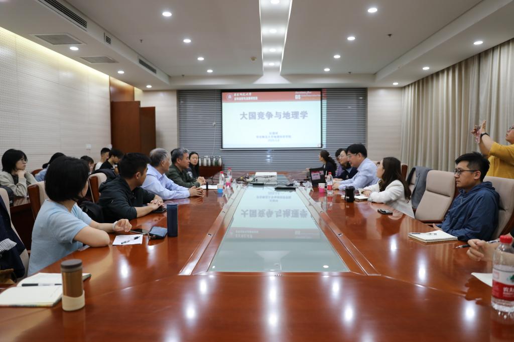 本站訊(通訊員 陳潔)5月8日上午,華東師范大學(xué)地球科學(xué)學(xué)部主任杜德斌教授應(yīng)邀到我校地理學(xué)部開展學(xué)術(shù)交流并作題為“大國競爭與地理學(xué)”的學(xué)術(shù)報告。報告會由地理學(xué)部黨委書記蘇睿先主持,孟廣文教授致歡迎辭,來自地理學(xué)部的四十余名師生參加了本次報告會。