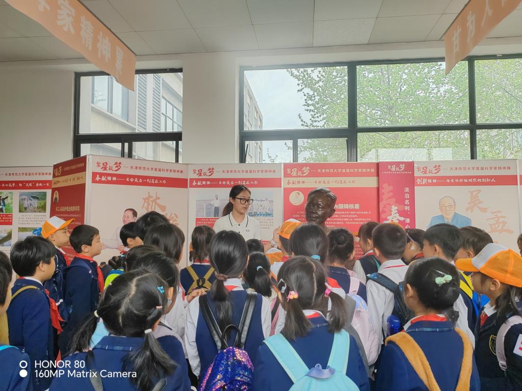 活動伊始,支部師生帶領同學們參觀了“繁星筑夢?天津師范大學首屆科學家精神展”。通過珍貴的歷史圖像和生動的故事,志愿講解員向孩子們展現了郭永懷、錢學森、屠呦呦、袁隆平等一大批現代科學家們追求真理、報效祖國的赤子之心。同學們駐足于展板前,眼神中充滿敬仰,紛紛表示:“要像科學家們一樣,用知識為祖國貢獻力量!”這場科學與愛國精神的洗禮,正是水室黨支部牢記為黨育人、為國育才初心使命的生動體現。