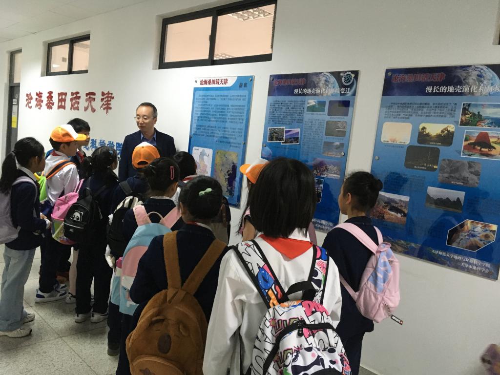 一組同學跟隨帶隊老師來到地理學部參觀“滄海桑田話天津”科普走廊。孟偉慶教授向同學們講述了天津的地質變遷、華北平原的形成、燕山山脈的形成以及為什么說天津是退海之地,讓大家了解了天津地區的地形地貌、水資源情況。孟教授還告訴同學們,天津雖然地處海河下游,擁有很多的河流,但這些河流由于海拔低、土壤鹽分含量高以及污染等原因,導致水質無法滿足生產生活的要求,天津是典型的“水質型”缺水城市,我們要節約水資源。通過參觀和介紹,同學們直觀理解了“綠水青山就是金山銀山”的深刻內涵,培養了他們“在天津、知天津、愛天津”的家國情懷。