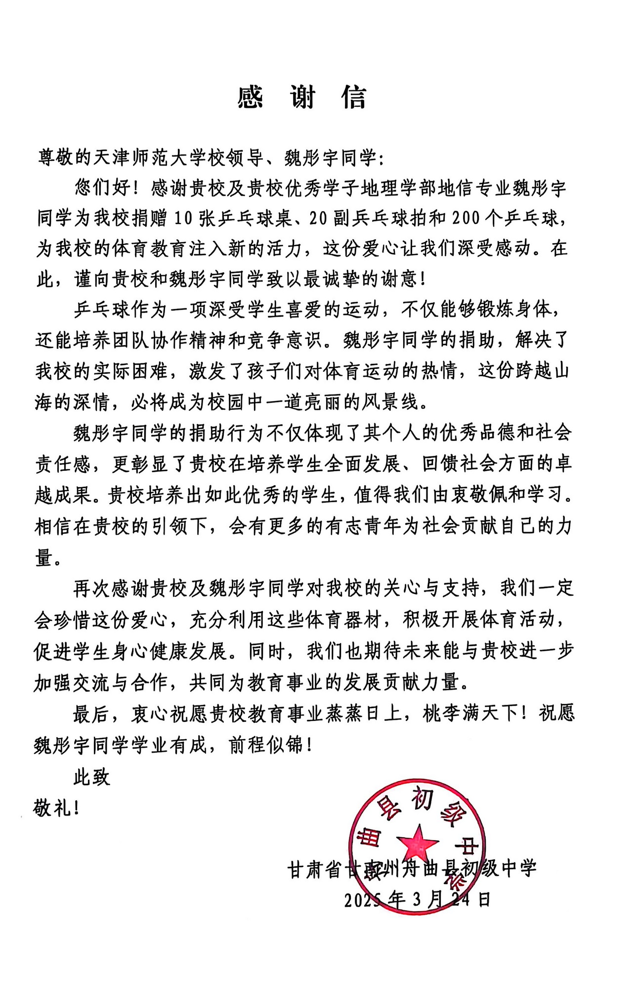 當(dāng)收到甘肅省甘南州舟曲縣初級中學(xué)的感謝信,看到小朋友們興奮地圍繞在乒乓球臺前時,魏彤宇更加堅信:善意無分輕重,每一縷微光皆能點亮心靈的旅程。