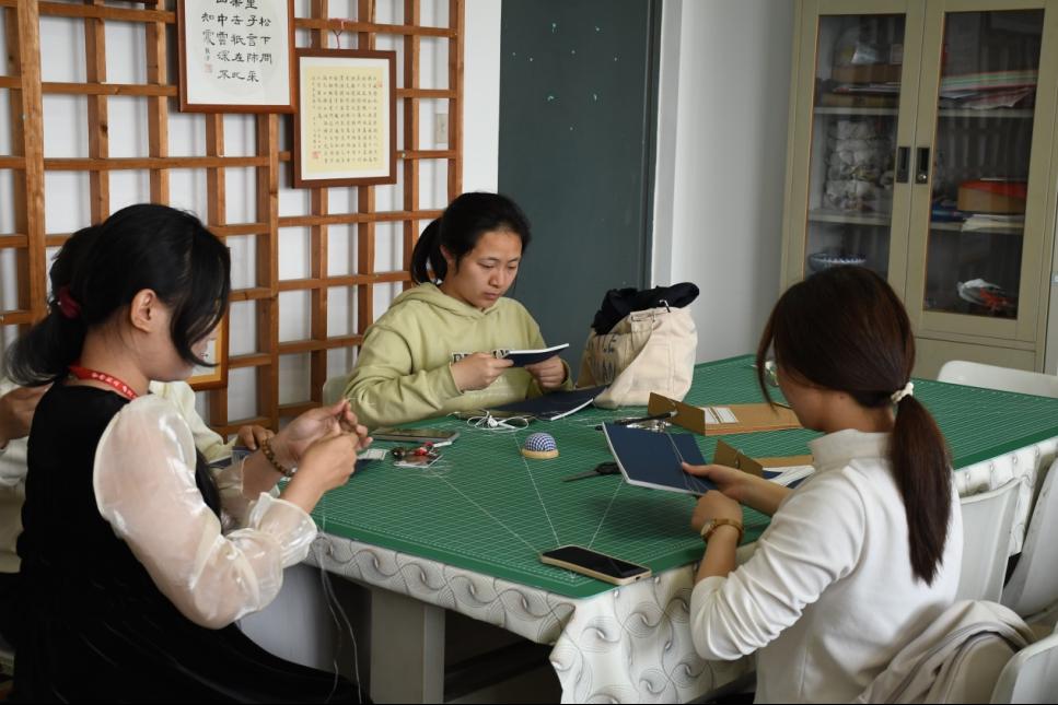 活動(dòng)中,歷史文化學(xué)院副院長(zhǎng)耿華以“書(shū)籍形態(tài)演變史” 為引,循著歷史脈絡(luò),從先秦簡(jiǎn)策、卷軸裝、經(jīng)折裝講到蝴蝶裝、包背裝直至線裝,借助多媒體設(shè)備生動(dòng)展示了古籍裝幀技藝的匠心與雕版印刷術(shù)的精妙。參與者們?cè)谘袑W(xué)導(dǎo)師的指導(dǎo)下,手持宣紙、銀針與棉線,完成折頁(yè)、齊欄、訂線、題箋等工序,在穿針引線間,零散宣紙變?yōu)楣艠憔€裝。