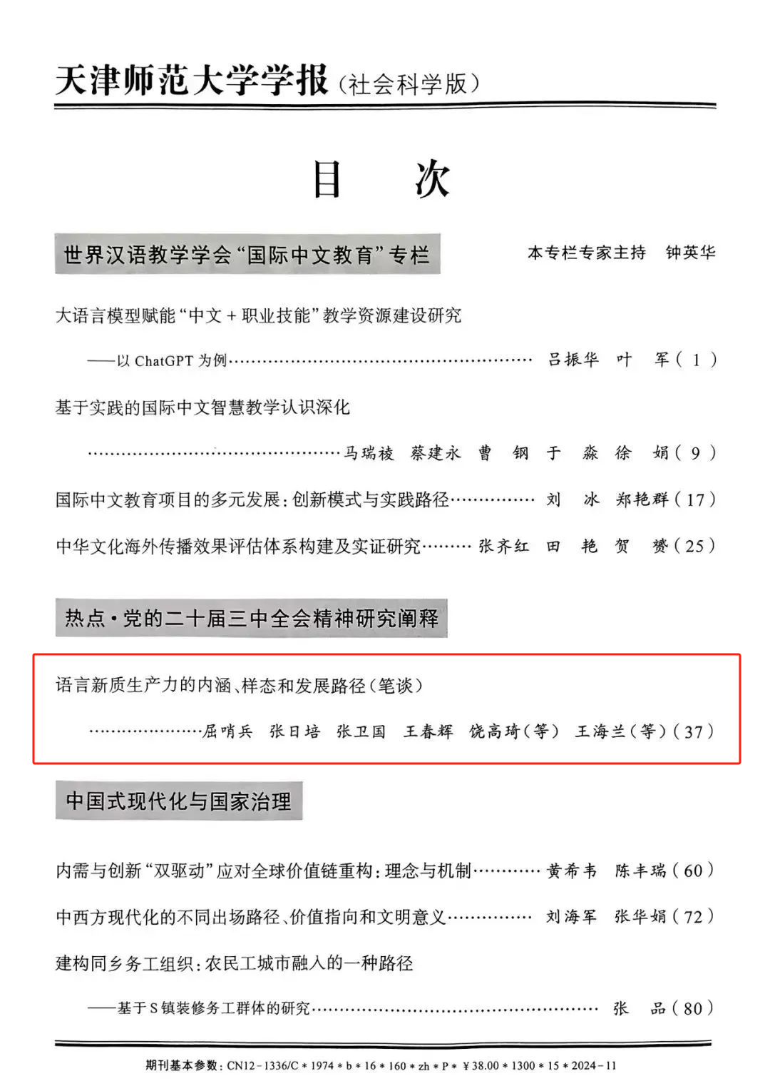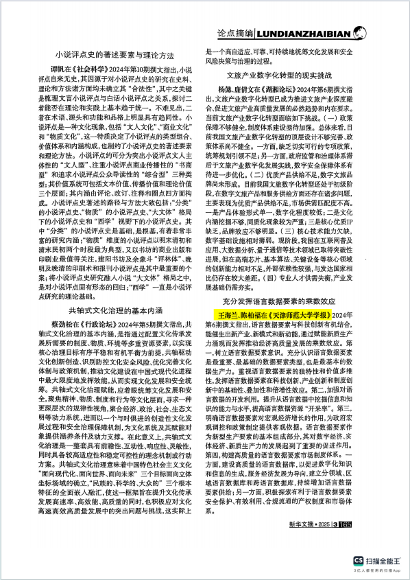 本站訊(通訊員 張珵)《天津師范大學學報(社會科學版)》2024年第6期文章《語言新質生產力的內涵、樣態和發展路徑(筆談)》中的《釋放語言數據要素價值 推動新質生產力發展》(作者:王海蘭、陳柏福,特約編輯:李永俊 張朝霞 ,責任編輯:關英明)論點被《新華文摘》2025年第3期摘編。