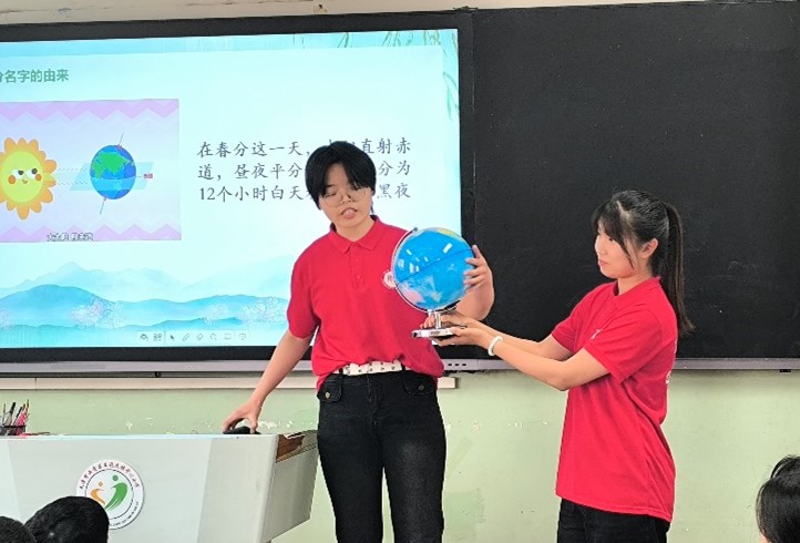 “白天黑夜一樣長,燕子歸來筑新巢……”實踐團成員以節氣謎語為引,借助動態演示揭開春分的奧秘。從“豎蛋測春”的民俗智慧到“春風裁柳”的物候規律,從農耕諺語到時令養生,成員們通過互動問答和多媒體演示,將天文地理、生物農學等跨學科知識轉化為趣味探索。