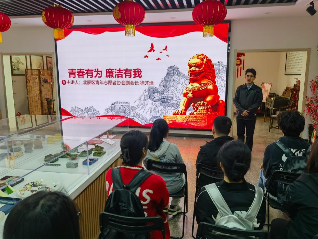 本站訊(通訊員 上官萌萌)為進一步涵養學生廉潔意識,落實新時代立德樹人根本任務,扎實推進“廉潔文化進校園”落地生根,3月26日下午,天津師范大學數學科學學院黨委副書記兼紀委書記彭永剛帶隊,組織師生10余人赴天津市北辰區半畝方塘非遺文化學院,開展“津門古韻潤初心 數學青年承文脈”廉潔文化主題團課實踐活動。全國青年馬克思主義者培養工程學員、半畝方塘非遺文化學院負責人、白氏點翠修復與制作技藝非遺傳承人李靖,北辰區青年志愿者協會副會長徐芃澤共同參與活動。