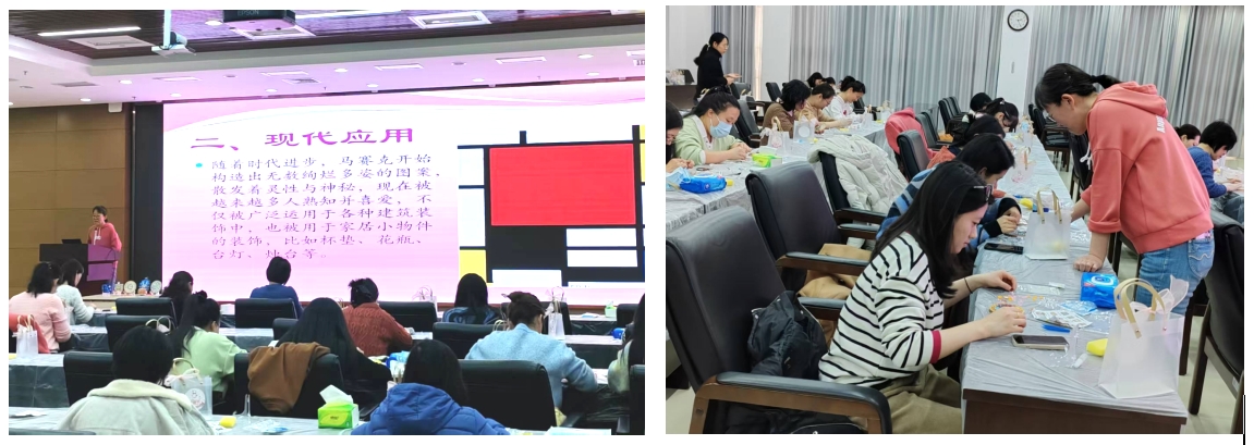 活動(dòng)以“春拂三月?巾幗逐夢(mèng)——馬賽克杯墊手工DIY”為主題,張方作為本次活動(dòng)的主講人,從拜占庭教堂的恢宏鑲嵌畫,到現(xiàn)代生活中馬賽克的美學(xué)應(yīng)用,系統(tǒng)講解了馬賽克藝術(shù)的歷史脈絡(luò)、工藝技法以及馬賽克杯墊的制作步驟和相關(guān)注意事項(xiàng),并在現(xiàn)場(chǎng)進(jìn)行了專業(yè)演示,讓參與活動(dòng)的老師們對(duì)制作過(guò)程有了清晰的了解。