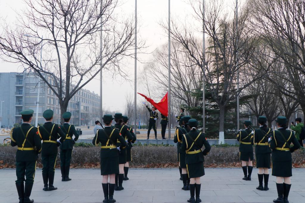 迎著朝陽,國旗護衛隊的旗手們邁著鏗鏘有力、整齊劃一的步伐走向升旗臺。在雄壯激昂的國歌聲中,鮮艷的五星紅旗冉冉升起,全體師生莊嚴肅立,齊聲高唱國歌。