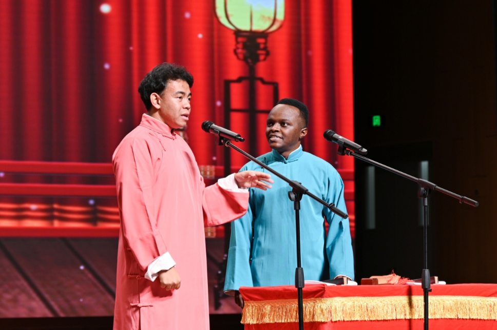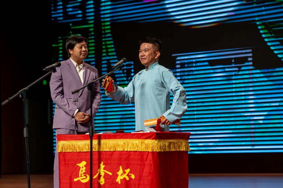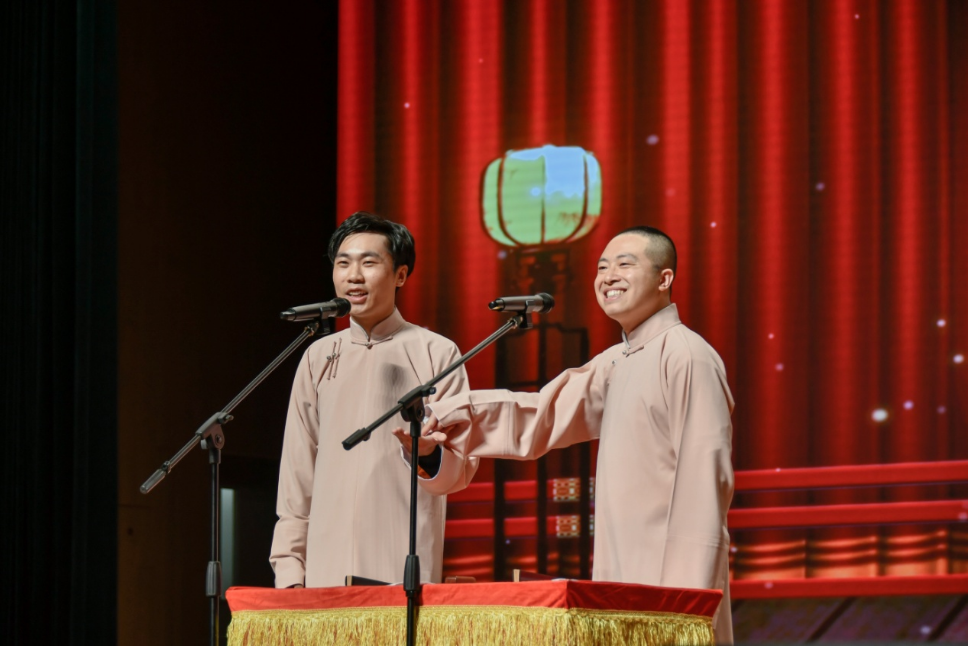女演員馮芮一段明快昂揚的快板《天安門廣場看升旗》為本次演出開場,緊接著便是楊皤、王子晨根據當前熱點AI人工智能創作的《假如生活AI了你》。尚琦、楊宗秋的相聲《愛情導師》將青年人對愛情的困擾生動地搬到舞臺之上,觸動了學生們心中的陣陣漣漪。孫弢、孫琦帶來《非常影評家》,電影生活巧妙結合,現場氣氛熱烈。來自馬達加斯加的唐磊和來自肯尼亞的孔愛凱對相聲文化的喜愛讓他們跨越了語言的限制,《歪批百家姓》將漢語幽默發揮得淋漓盡致,與觀眾小朋友的互動更是惹得觀眾哄堂大笑。董建春和李春熠兩位經驗豐富的演員最后出場,《三打白骨精》臺風扎實,技巧多樣,將本場演出推向高潮。