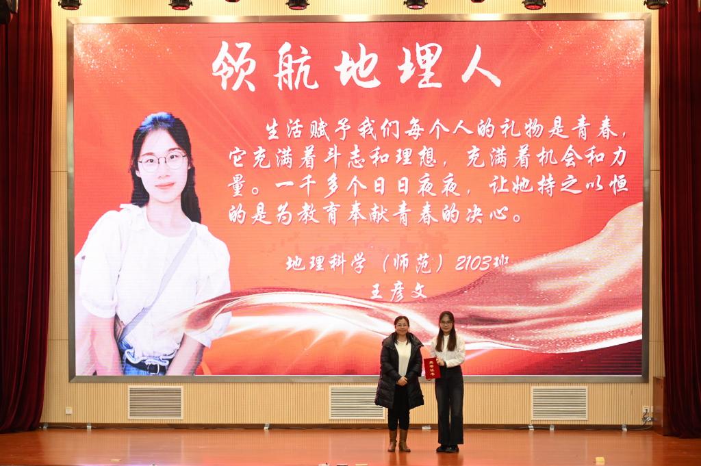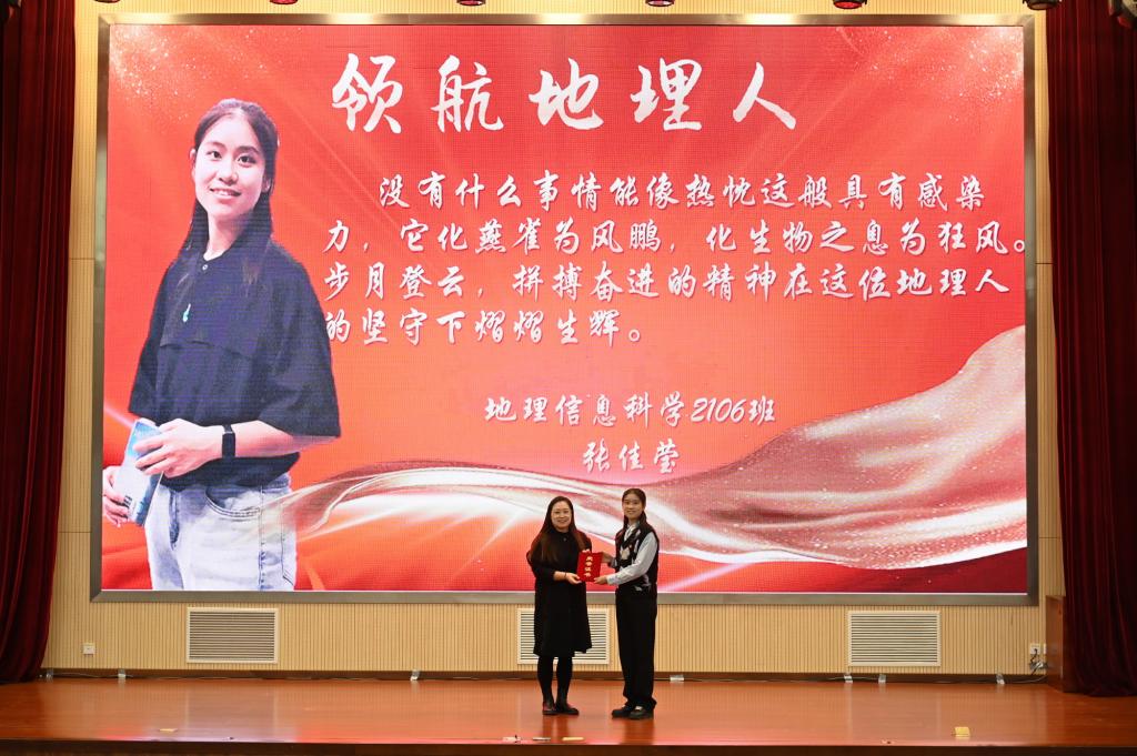 國家獎學金獲得者謝子豪和張佳瑩講述了自己的成長故事,兩位優秀學子分別被推免至華中師范大學和南方科技大學,將繼續在他們深愛的地理教育行業和行星遙感領域披荊斬棘,發光發熱。