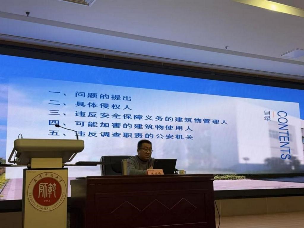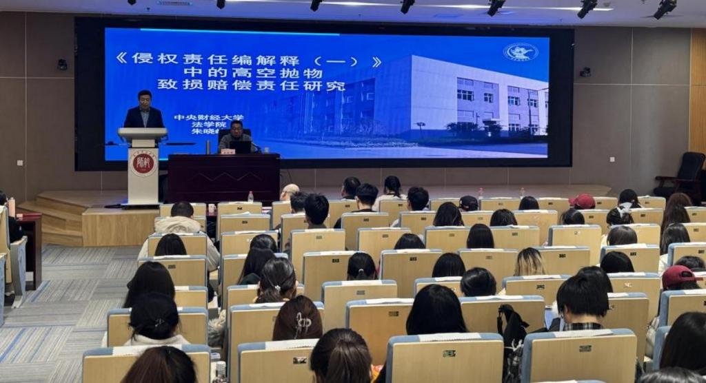本站訊(通訊員 侯慧秀)12月6日,法學院“中聯法學講壇”系列活動在京津冀教師發展協同創新中心小報告廳舉行,中央財經大學法學院教授、博士生導師朱曉峰以“《侵權責任編解釋(一)》中的高空拋物致損賠償責任研究”為題作報告。講座由法學院院長郝磊主持,法學院副院長郭明龍、中聯律師事務所天津辦公室高級合伙人邱凱律師以及天津君輝律師事務所高級合伙人張卿卿律師擔任與談嘉賓。法學院研究生與本科生共180余人參加此次講座。