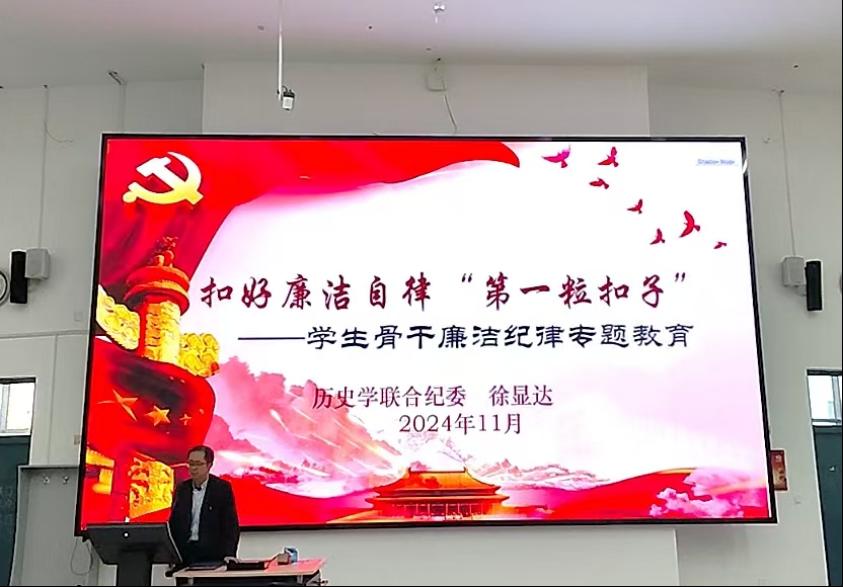 本站訊(通訊員 周二保)為深入貫徹落實(shí)習(xí)近平總書記關(guān)于加強(qiáng)新時(shí)代廉潔文化建設(shè)的部署要求,教育引導(dǎo)學(xué)生知廉、愛(ài)廉、興廉,提升廉潔自律意識(shí)和紀(jì)律規(guī)矩意識(shí),近日,歷史學(xué)聯(lián)合紀(jì)委面向?qū)W生骨干開展題為“扣好廉潔自律的‘第一??圩印绷疂嵓o(jì)律專題教育講座。歷史文化學(xué)院、歐洲文明研究院輔導(dǎo)員、學(xué)生會(huì)全體學(xué)生骨干共計(jì)200余人參加活動(dòng)。