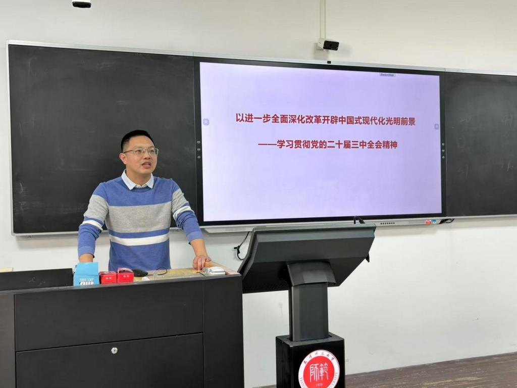 王春以《以進一步全面深化改革開辟中國式現代化光明前景——學習貫徹黨的二十屆三中全會精神》為題,從進一步全面深化改革的重大意義和總體要求、聚焦重點在更高水平上進一步全面深化改革和提高黨對進一步全面深化改革的領導水平三個方面,帶領老師們一同學習了習近平總書記《關于〈中共中央關于進一步全面深化改革、推進中國式現代化的決定〉的說明》和《中共中央關于進一步全面深化改革、推進中國式現代化的決定》等重要內容,并就構建支持全面創新體制機制的主要內容與老師們進行重點講解和學習分享。