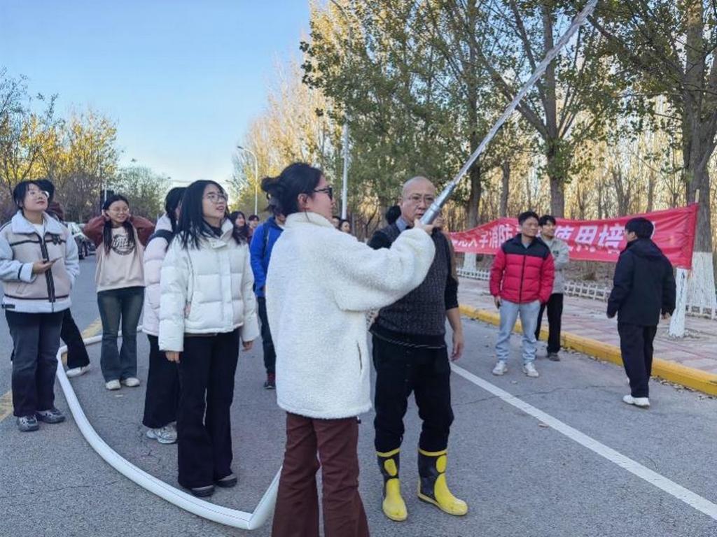 室內(nèi)消火栓是最常見的建筑消防滅火設(shè)施,張辰昊為同學(xué)們講解了消防水帶和水槍等器材的配套使用方法,同學(xué)們親自體驗了使用消火栓的整個過程。