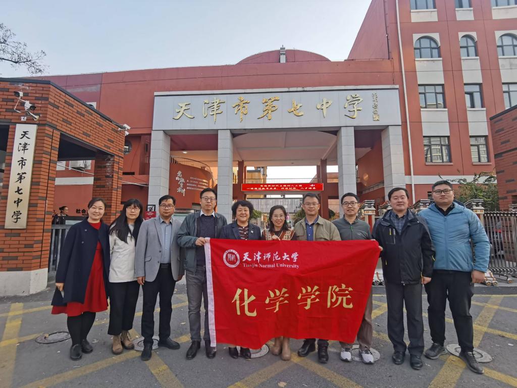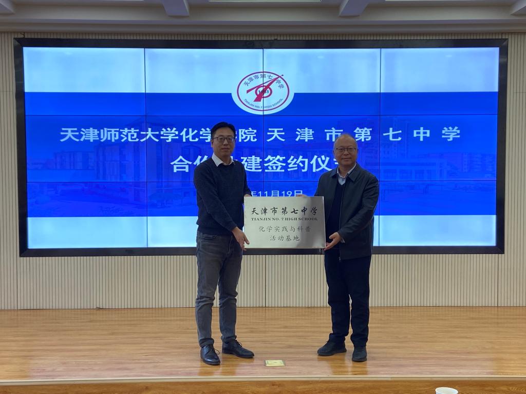 本站訊(通訊員 李小軒)11月19日下午,化學學院赴天津市第七中學開展訪企拓崗活動,并舉辦實踐教學基地簽約暨揭牌儀式,標志著雙方在科學教育、化學實踐及教學實踐等領域開啟合作新篇章。我校化學學院黨委書記吳金明,黨委副書記楊欣艷,副院長朱柏林、李程鵬;天津市第七中學黨委副書記、校長王保慶,副校長鄭建權、王振紅,及兩校部分教師代表參加。