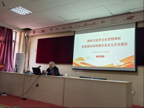 本站訊(通訊員 劉兆文)為進一步學習宣傳貫徹習近平文化思想,11月7日下午,文學院黨委邀請天津市教育系統關工委“習近平新時代中國特色社會主義思想和黨的二十大精神研學基地”理論宣講團成員,我校關心下一代工作委員會副主任、文學院教授李逸津為第70期入黨積極分子作題為《高舉習近平文化思想旗幟全面強化和完善社會主義文化建設》的專題講座。文學院輔導員代表、青年教師代表、學生黨員和第70期入黨積極分子參加。講座由院黨委副書記、紀委書記魏晉雪主持。