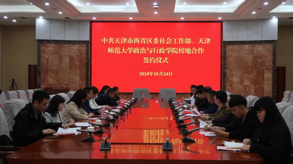 本站訊(通訊員 于淼)10月24日,政治與行政學(xué)院和西青區(qū)委社會(huì)工作部聯(lián)合開展“黨建聯(lián)建,共譜西青社會(huì)工作新篇章”黨日活動(dòng)暨校地合作簽約儀式。學(xué)院黨委書記姜德紅帶隊(duì),赴天津鵬瑞利國(guó)際養(yǎng)老康護(hù)社區(qū)和西青區(qū)人壽堂養(yǎng)老院參觀考察,并在張家窩鎮(zhèn)鎮(zhèn)政府與西青區(qū)委社會(huì)工作部簽訂了合作框架協(xié)議。西青區(qū)委社會(huì)工作部部長(zhǎng)趙金璽、副部長(zhǎng)朱宏業(yè)、崔秀玲與學(xué)院師生進(jìn)行了交流。