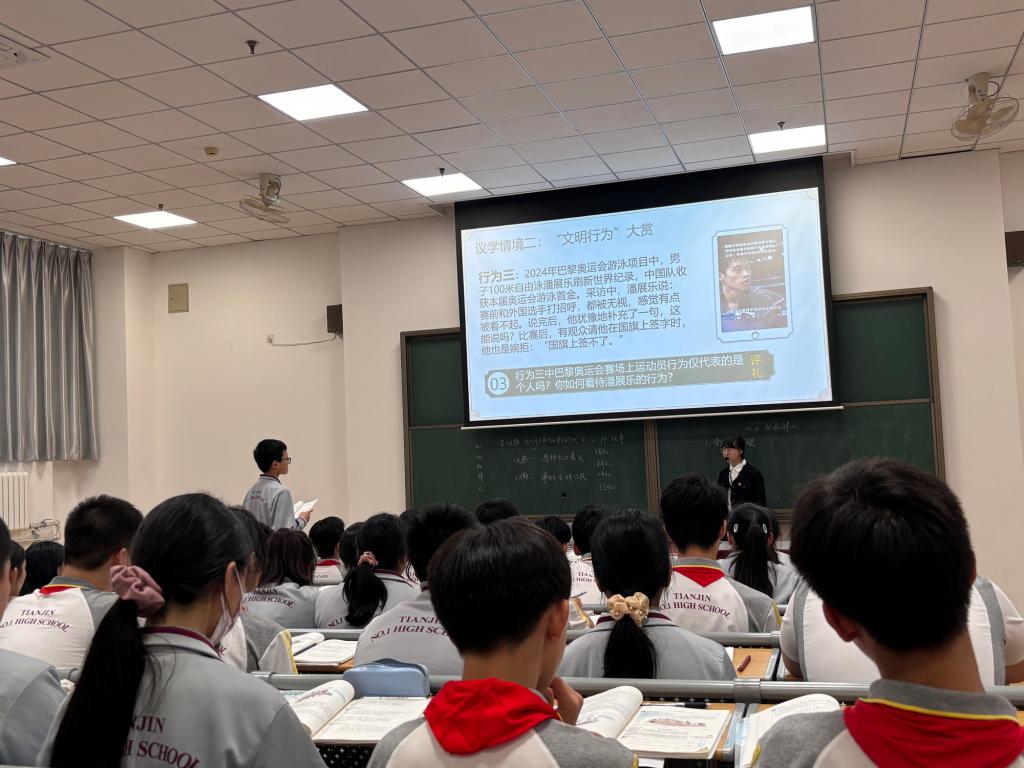 與會師生先后觀摩學習了天津市第一中學思政課教師遲筱瑾講授的高一年級思政課程“只有社會主義才能救中國”和高曼講授的八年級思政課程“以禮待人”,兩位老師的授課深入淺出,內容豐富翔實,語言形象生動,充分展現了扎實的教學基本功和良好的教師專業素養。