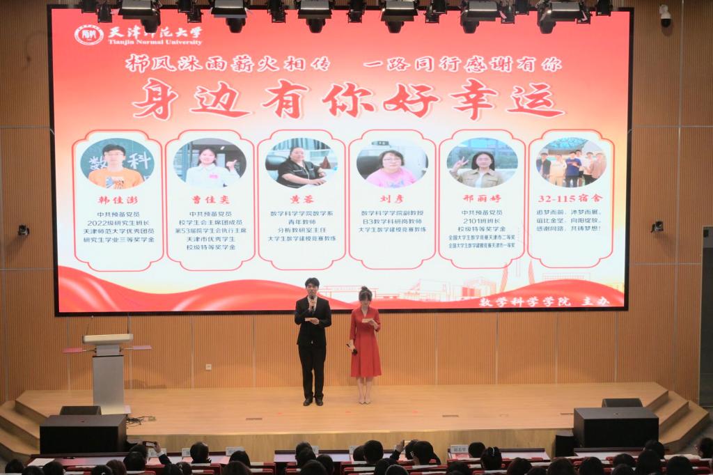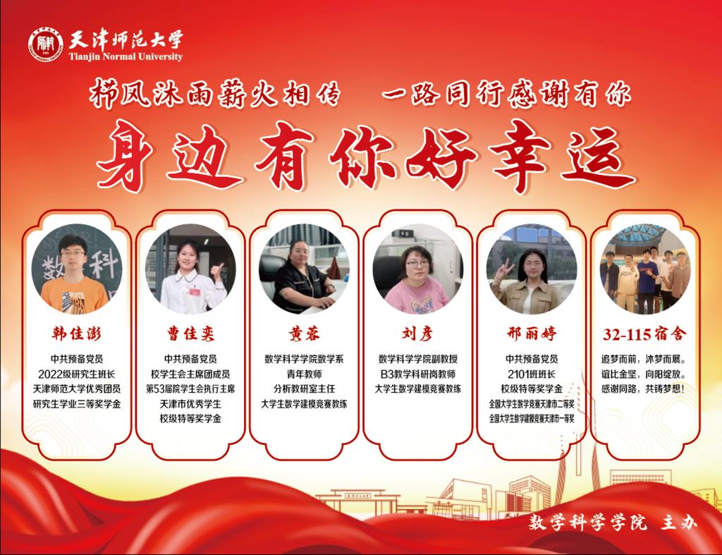 開學(xué)典禮結(jié)束后,學(xué)院舉行“身邊有你好幸運(yùn)”表彰會(huì)。數(shù)學(xué)科學(xué)學(xué)院黃蓉老師、劉彥老師、2022級(jí)研究生韓佳澎、2021級(jí)本科生曹佳奕和邢麗婷、35號(hào)樓115宿舍分別受到表彰。