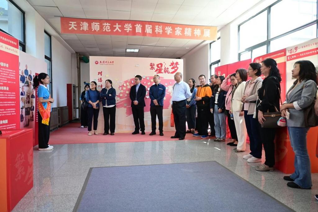 班會后,校友們饒有興致地參觀了天津市科普基地——科學體驗館、“繁星筑夢”天津師范大學首屆科學家精神展和“循跡啟航”天津師范大學物理科普成果展。與正在開展研學的中小學生親切交流,在學院歷屆畢業生合影長廊追尋記憶,在明理樓前廣場的校友畢業30年返?;顒又黝}背景墻前合影留念。