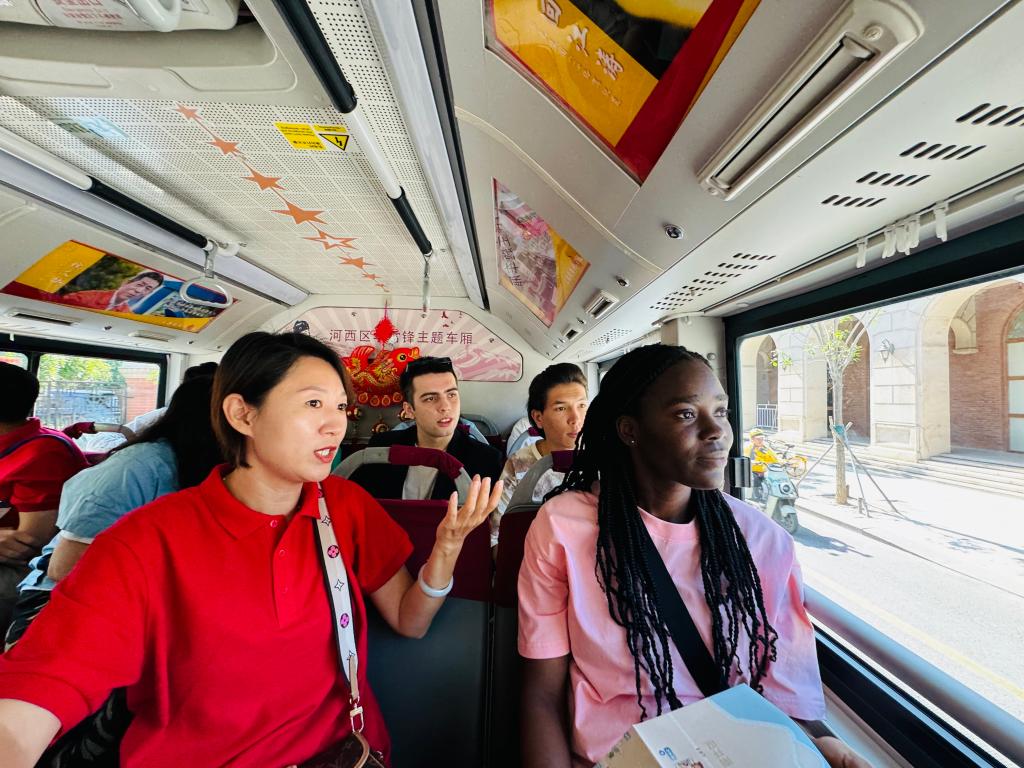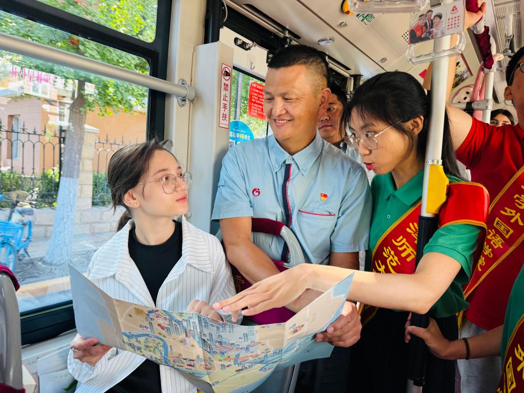 外國(guó)語(yǔ)學(xué)院消息(通訊員 陳乾坤)9月16日上午,天津師范大學(xué)的外籍留學(xué)生走進(jìn)市公交集團(tuán)第二客運(yùn)有限公司體北中心車(chē)隊(duì),乘坐天津首部“文明有禮號(hào)”公交車(chē),開(kāi)展了一場(chǎng)沉浸式探索天津街區(qū)文化的游學(xué)之旅。來(lái)自外國(guó)語(yǔ)學(xué)院“用英語(yǔ)講中國(guó)故事”“講好天津故事”的宣講團(tuán)成員用多語(yǔ)種講述天津故事,展現(xiàn)天津魅力,為提升中華文化國(guó)際影響力,促進(jìn)文化交流與融合展現(xiàn)青春力量。