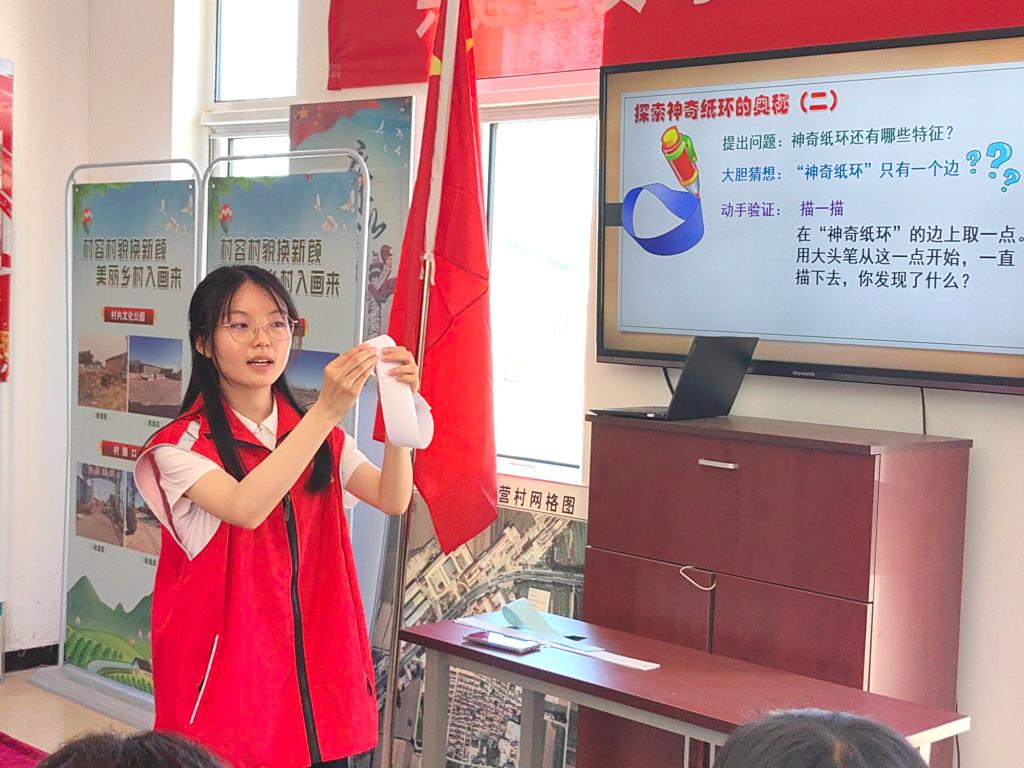 在王口鎮南萬營村,實踐團成員面向中小學生、成年人及老黨員等群體,開展了形式多樣的科普宣講活動。他們結合數學專業優勢,充分發揮師范專業特長,通過航模講解與展示、莫比烏斯帶數學科普等趣味活動,激發學生對科學和數學的學習興趣,傳播科學教育理念與跨學科教育觀念,為鄉村教育振興注入新活力。