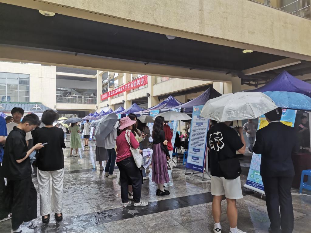 團市委基層建設部、學校部相關負責同志來到招聘會現場調研招聘情況。盡管雨勢不減,但招聘會現場氛圍熱烈,畢業生們與招聘單位互動交流,介紹自己的專業技能和綜合素質,招聘單位熱情地向學生介紹單位情況、崗位需求和發展前景,為學生提供職業規劃指導。