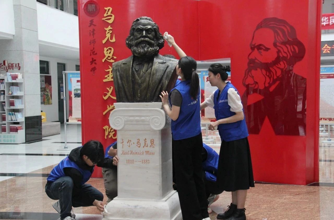 卡爾·馬克思雕像莊嚴(yán)肅穆,同學(xué)們滿懷敬意,撣掃擦拭雕像,表達(dá)了對(duì)馬克思的敬仰和懷念之情。馬克思主義中國(guó)化專業(yè)2023級(jí)碩士研究生王抗抗、馬克思主義理論專業(yè)2020級(jí)本科生王遠(yuǎn)眸和思想政治教育(師范)專業(yè)2023級(jí)本科生張?jiān)辞逡哉b讀的方式帶領(lǐng)同學(xué)們回顧了馬克思的生平。