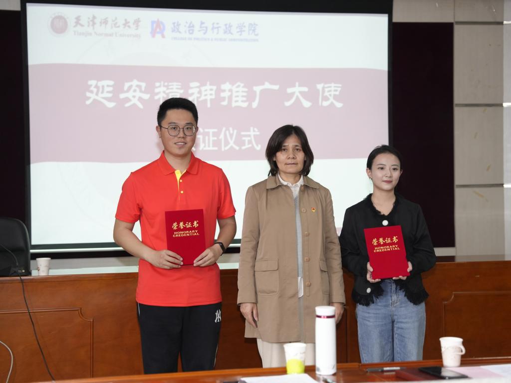 姜德紅為牛曉耕、王鈺頒發“延安精神宣講員”聘書,希望他們充分發揮學院學生理論宣講團優勢,深入研究、傳承、踐行好延安精神,爭當弘揚延安精神的排頭兵、領頭雁。