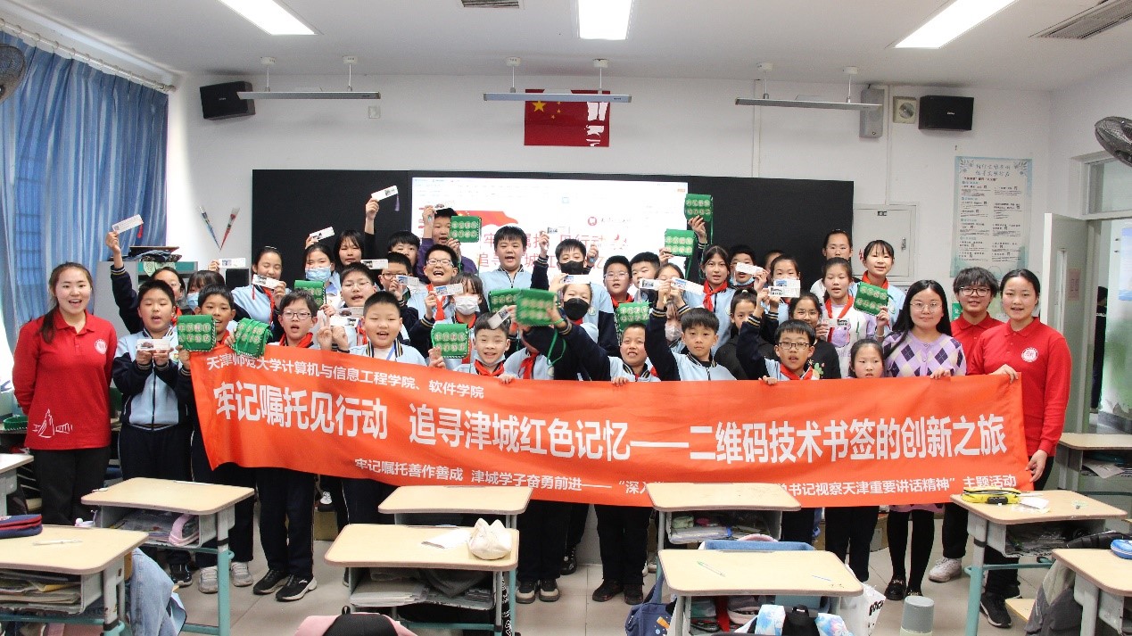 在“牢記囑托見行動 追尋津城紅色記憶——二維碼技術書簽的創新之旅”科普思政實踐課程中,實踐團成員帶領學生們以天津各大紅色紀念館為主題,通過手繪和拼貼的方式,制作帶有紅色革命紀念館介紹二維碼的書簽。實踐團成員掃描二維碼,將各大紅色革命紀念館中革命先輩的偉大事跡呈現給學生們,在使學生們領略奇妙的二維碼技術的同時傳承紅色基因,賡續精神血脈。
