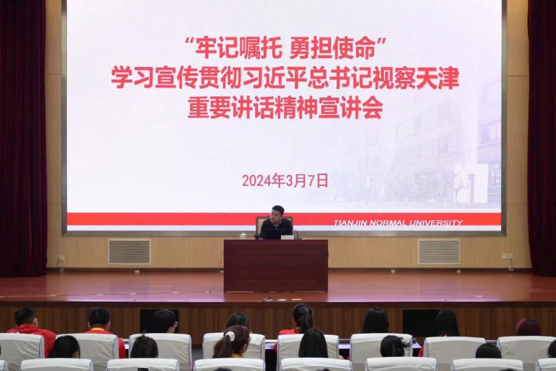 校團委消息(通訊員 孟亮)為深入學習宣傳貫徹習近平總書記視察天津重要講話精神,激勵我校廣大團員青年堅定信心決心,感恩實干奮進,3月7日下午,校團委組織全校基層學部(院)團委書記、校青馬班學員、校院兩級團學骨干共計300余人召開“牢記囑托 勇擔使命”學習宣傳貫徹習近平總書記視察天津重要講話精神宣講會。會議邀請中共天津市委黨校公共管理教研部劉學副教授做專題報告。