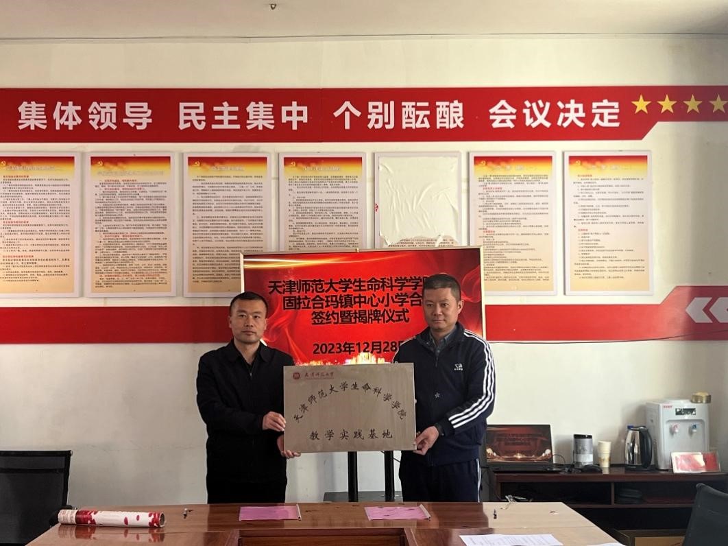 黨委學工部、生命科學學院消息(通訊員 楊晨)近日,天津師范大學生命科學學院與策勒縣固拉合瑪鎮中心小學共建教學實踐基地簽約儀式舉行。策勒縣教育局負責同志出席并致辭,固拉合瑪鎮中心小學與我校生命科學學院相關負責同志參加儀式。