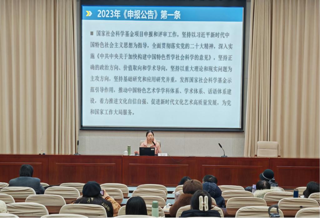 天津工業大學人文學院教授周丹分享了全國藝術規劃課題的申報經驗。她結合個人申報成果,圍繞精準定位全國藝術規劃選題、課題切入點、學界熱點、研究價值、研究創新、申報書論證、申報書質量等方面,對全國藝術規劃的申報要點進行了詳細指導,并提出一系列建設性指導意見。周丹表示,申報書的填寫必須嚴謹認真,申報人對每個部分都要仔細斟酌和思考,要早做準備、勤于交流、持續打磨、久久為功。