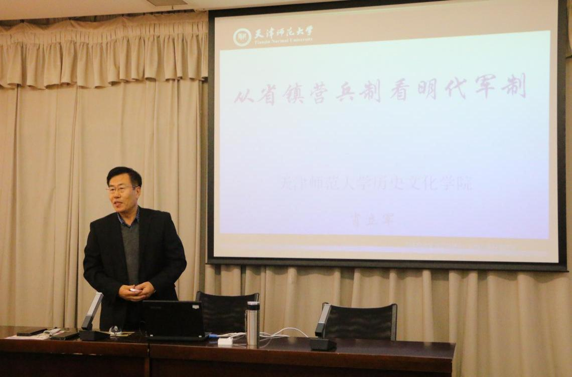 開幕式結束后,歷史文化學院中國史系主任、中國史一級學科帶頭人、博士生導師肖立軍為兩院研究生作題為《從省鎮營兵制看明代軍制》的學術節首場講座。肖立軍在明代軍事制度的研究中,開創性提出省鎮營兵制的概念。他詳細介紹了省鎮營兵制度的內容,闡釋了省鎮營兵制與衛所制、京營制的關系以及明代軍制的演變過程。講座最后,肖立軍耐心解答了同學們的疑問,并交流了對明代軍事史的新看法、新觀點,同學們受益良多。