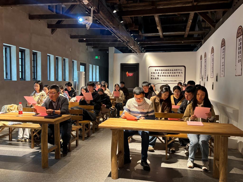 北洋法政學堂是李大釗先生早期思想孕育和形成的重要搖籃。師生們跟隨講解員,步入《鐵肩擔道義·熱血潤山河——李大釗與天津》主題陳列展。一張張老照片、一件件珍貴文獻,都在無聲地訴說著青年李大釗在天津求索真理、揮斥方遒的崢嶸歲月。博士生黨員鹿曉東帶領大家全面回顧了李大釗先生的革命生涯,為這段歷史注入了當代的回響。